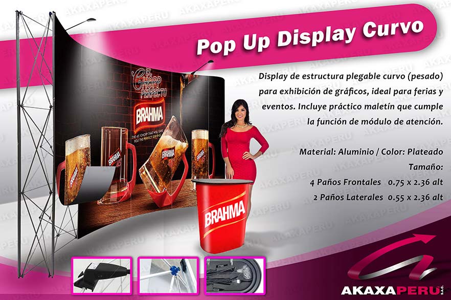 Display de estructura plegable curvo (pesado) para exhibición de gráficos, ideal para ferias y eventos. Incuye práctico maletín que cumple la función de módulo de atención.